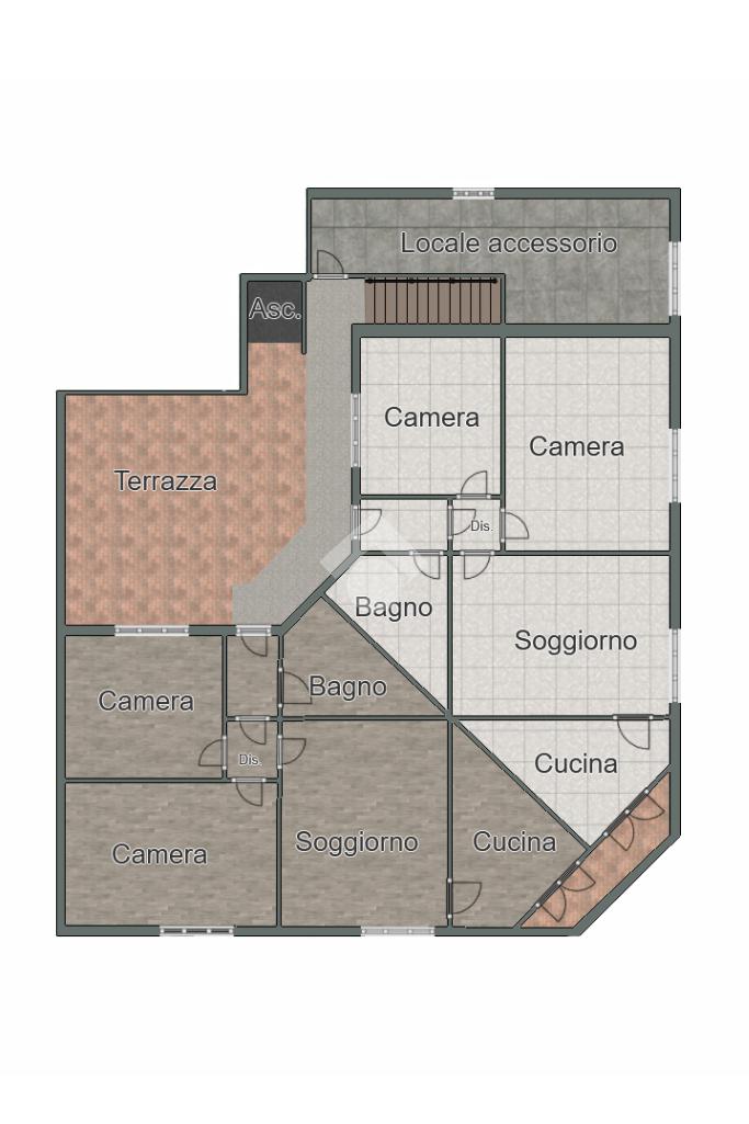 Il primo piano è composto da due trilocali di circa 80 m² ciascuno ben distribuiti e luminosi, dotati di un ampio terrazzo e di un balcone in comune.