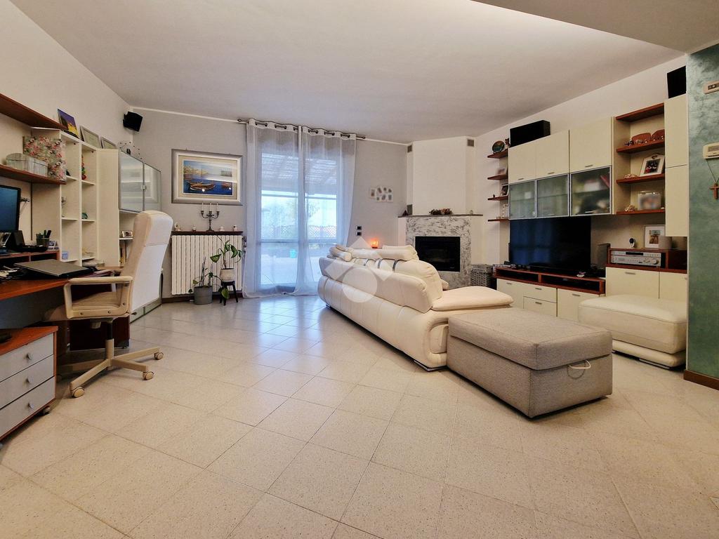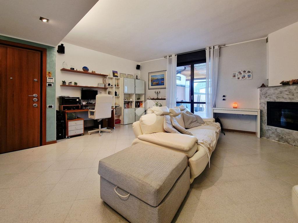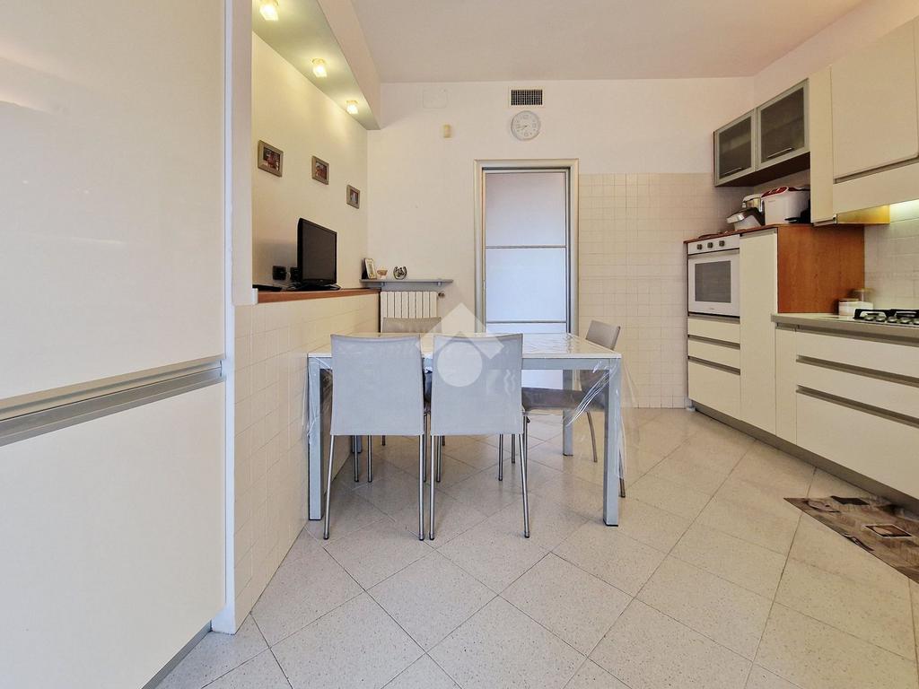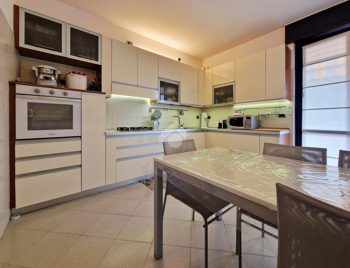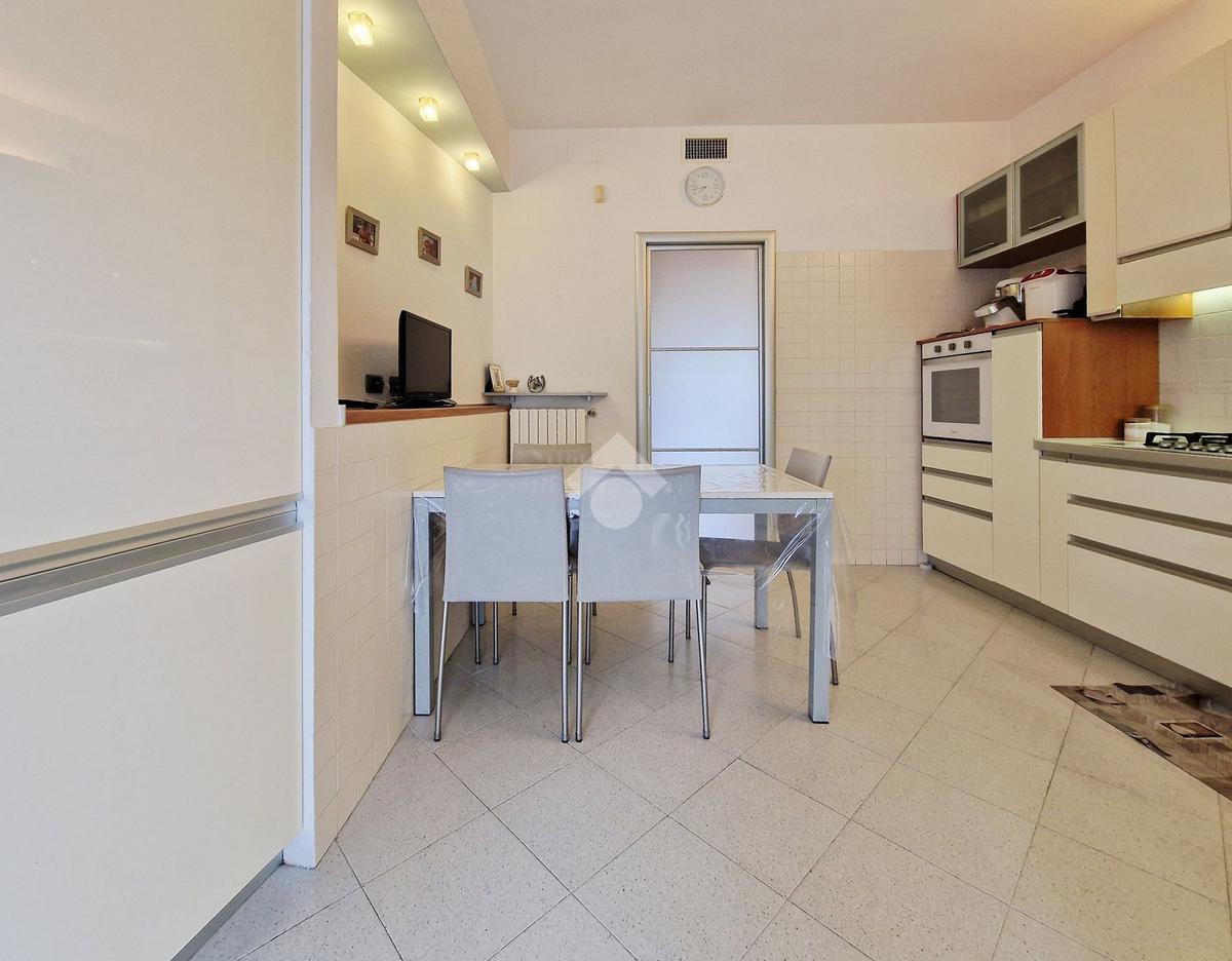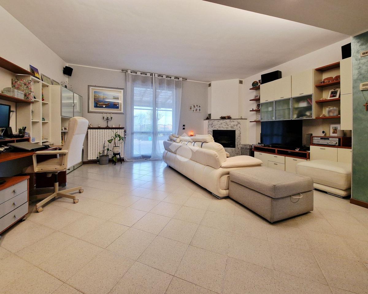 L'ingresso è sull'ampio e luminoso soggiorno caratterizzato dal camino a pellet mentre la cucina abitabile dispone di uscita sul pratico balcone.