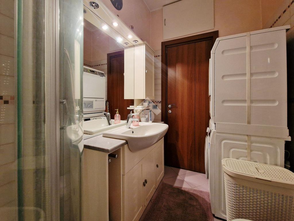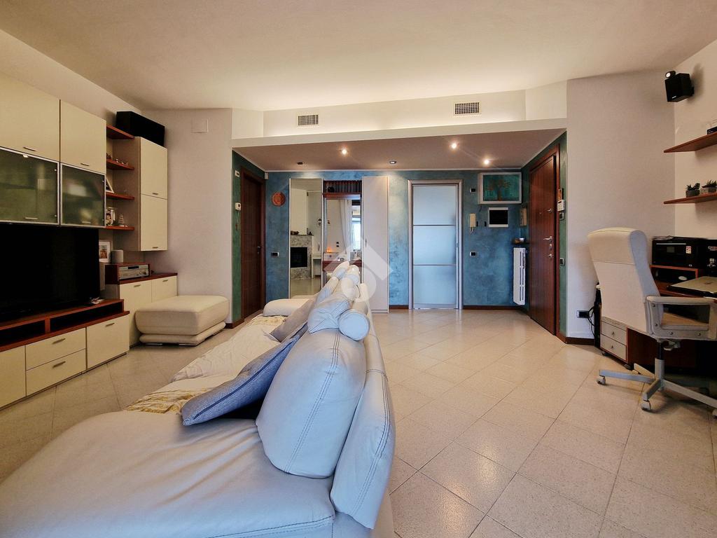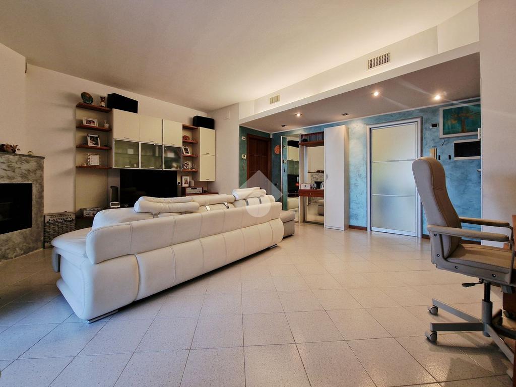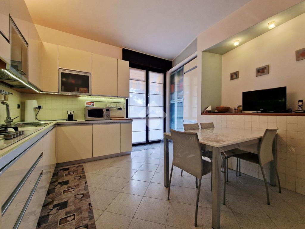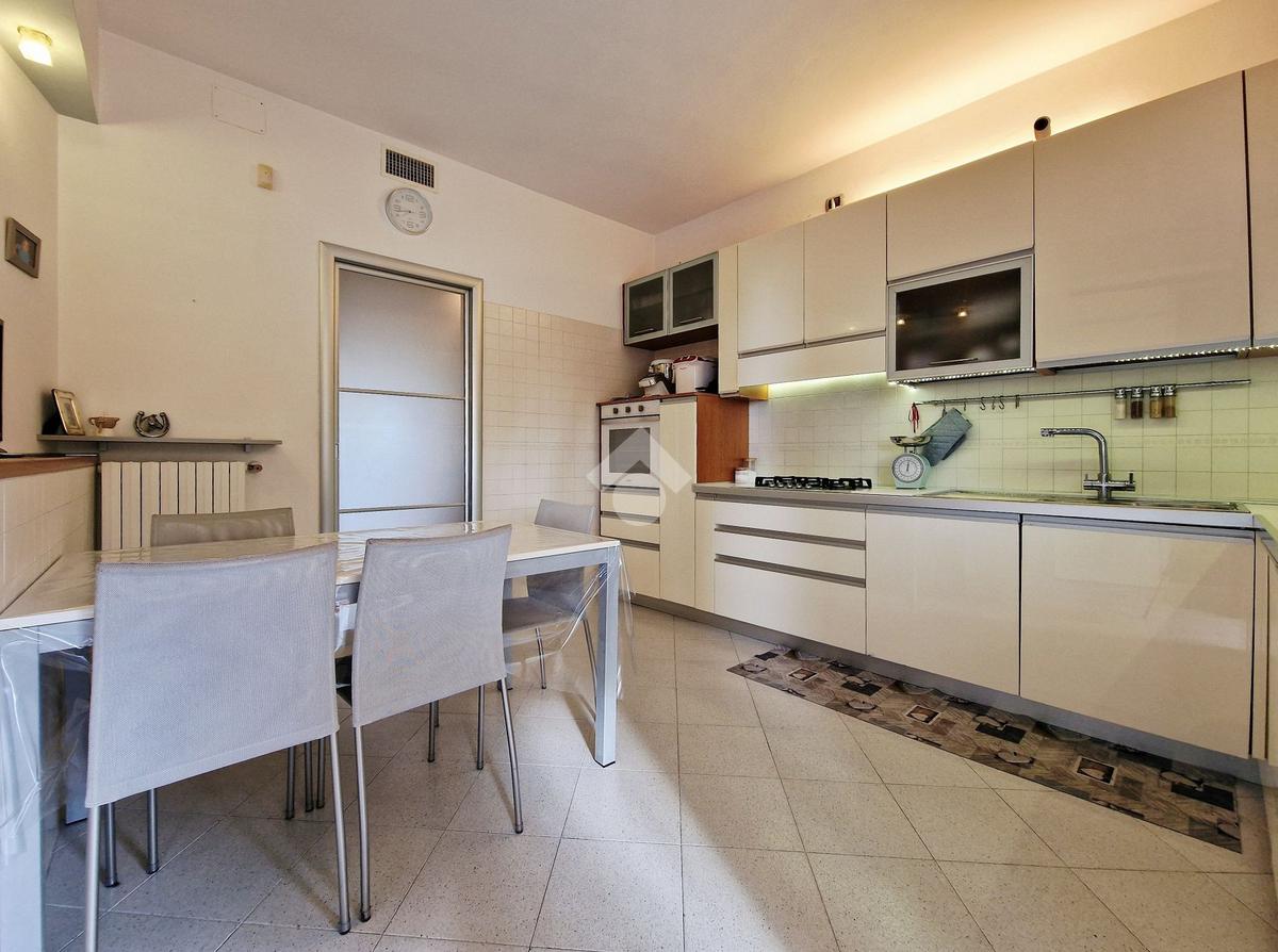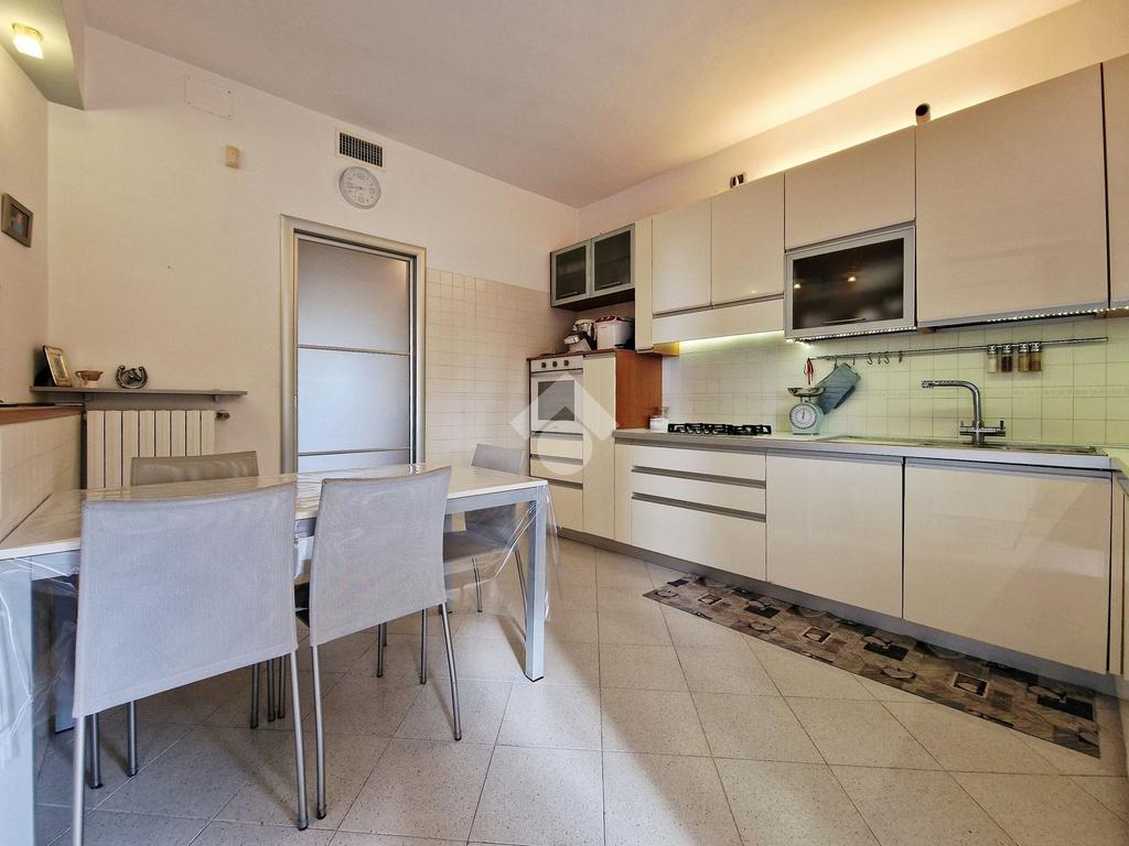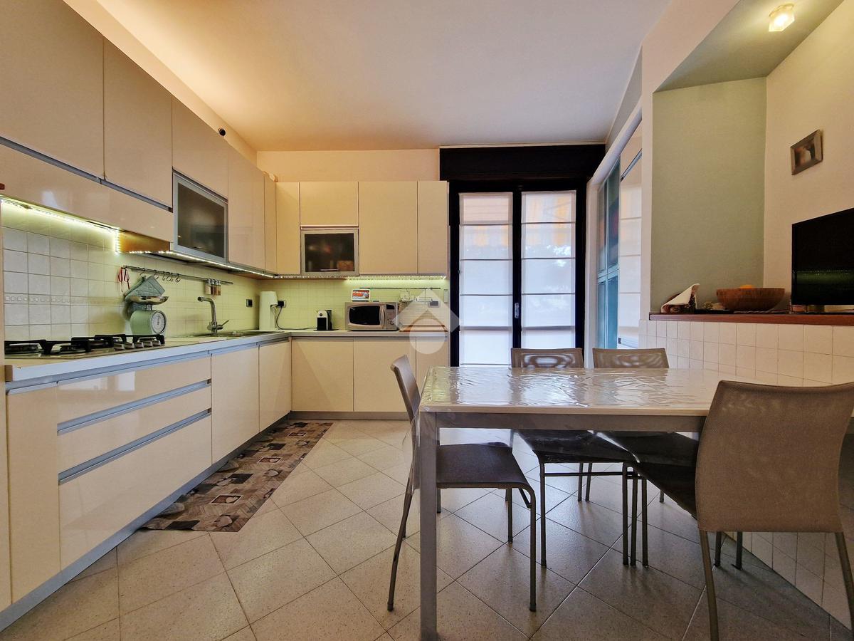 L'ingresso è sull'ampio e luminoso soggiorno caratterizzato dal camino a pellet mentre la cucina abitabile dispone di uscita sul pratico balcone.