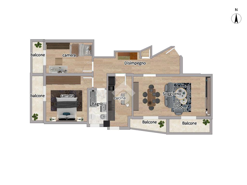 L'ingresso è sul pratico disimpegno con ripostiglio che collega tutti i locali della casa. La zona giorno è valorizzata dal soggiorno doppio e la cucina abitabile mentre la zona notte dispone di due spaziose camere da letto e un bagno finestrato con vasca.