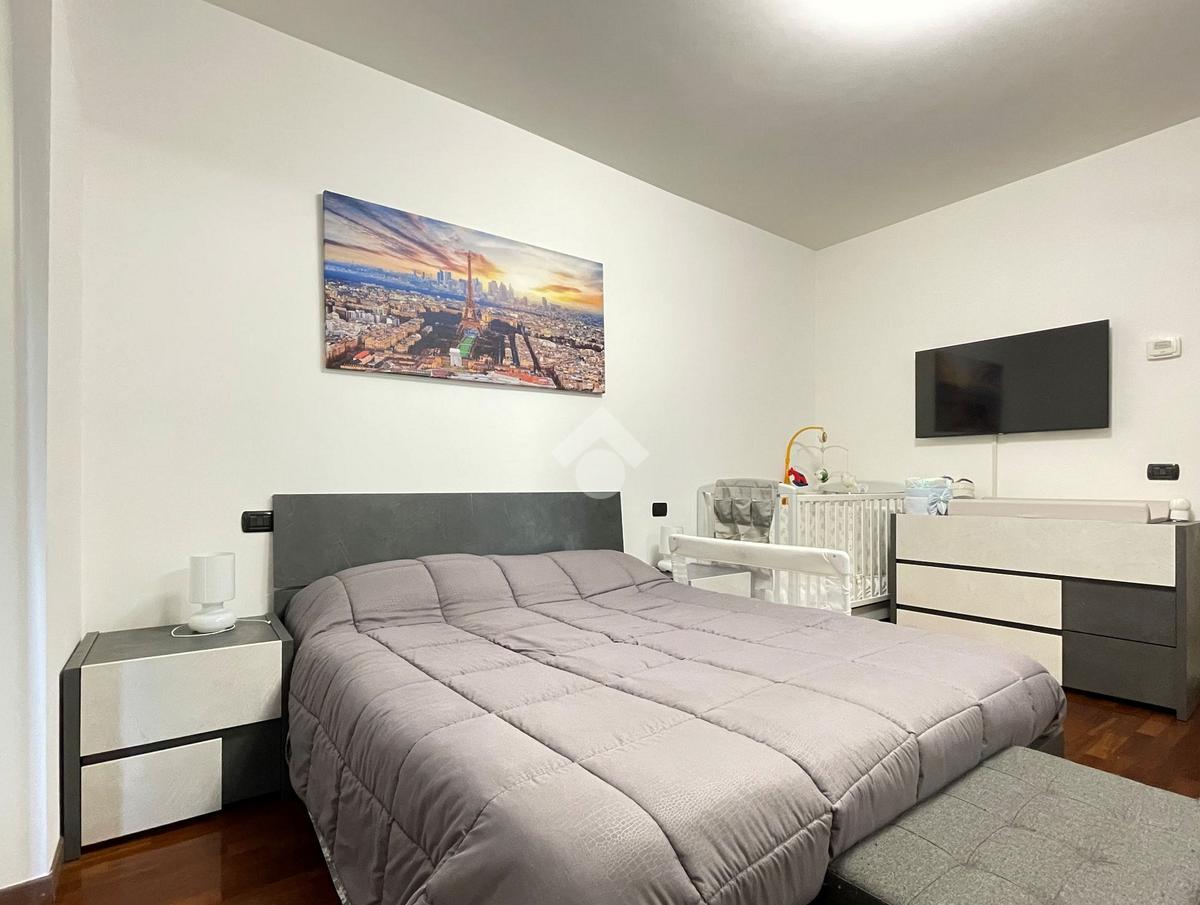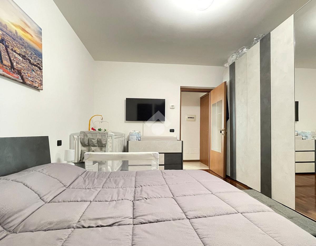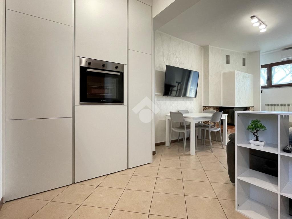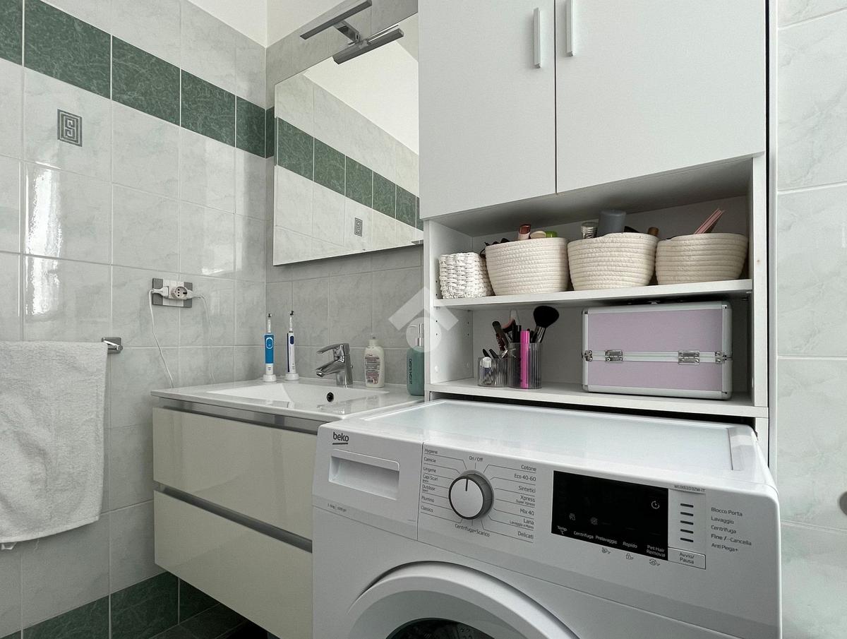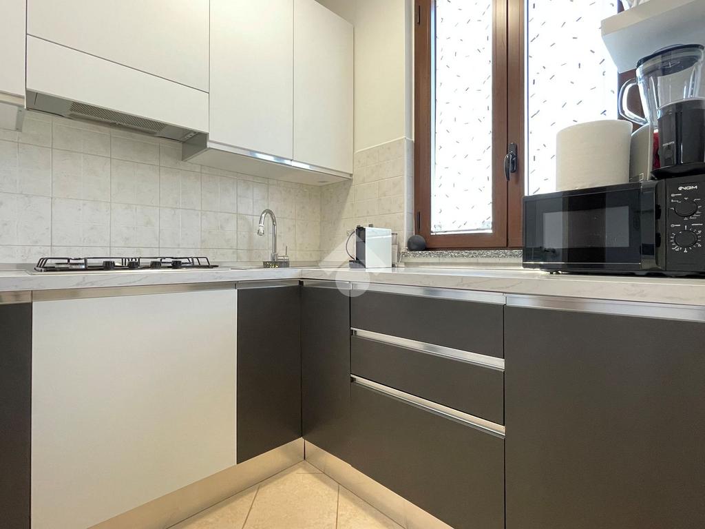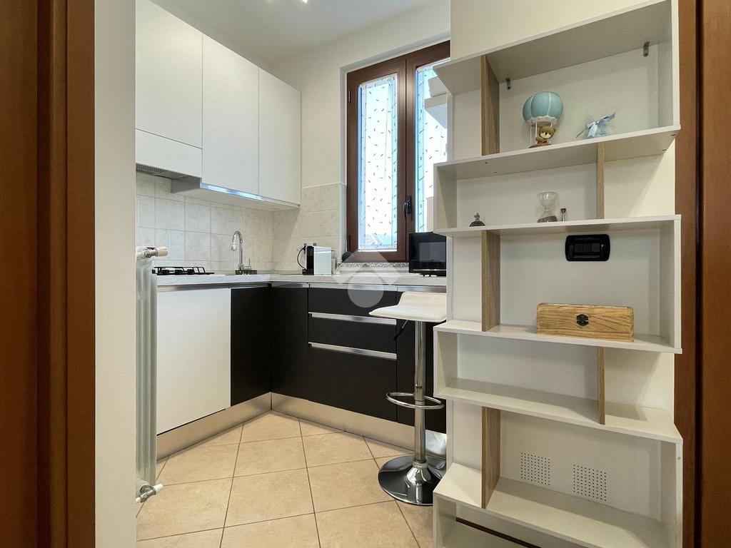 L'ingresso è sulla zona giorno con cucina a vista mentre il comodo disimpegno conduce alla camera da letto matrimoniale rifinita con pavimento in parquet e al bagno finestrato, rivestito con ceramiche moderne e completo di doccia.