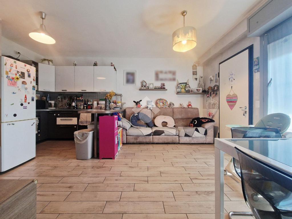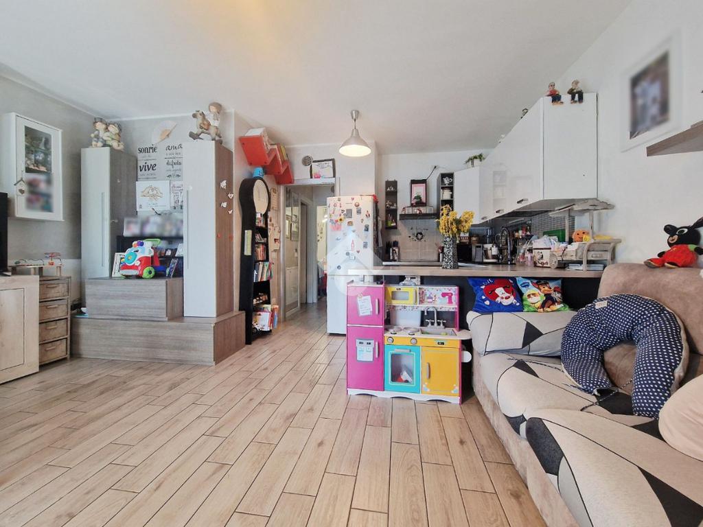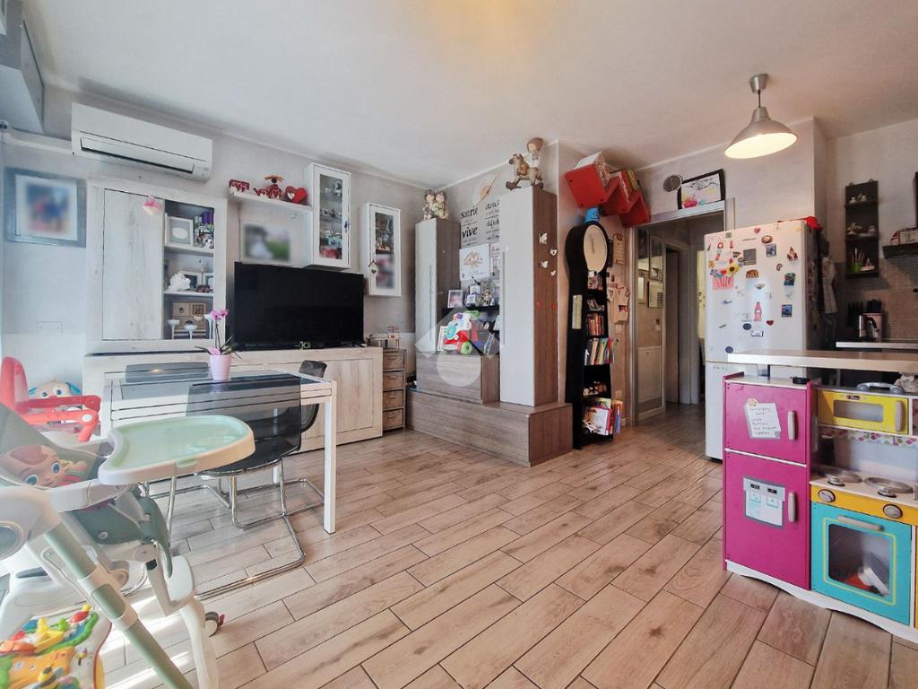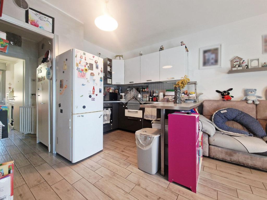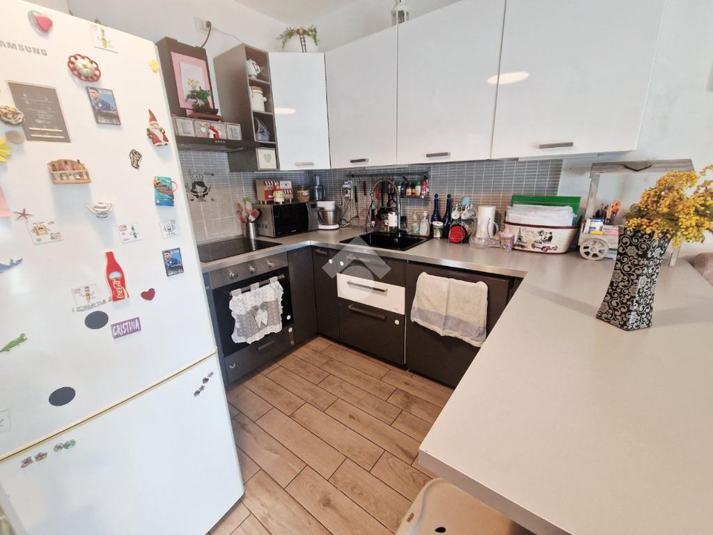 L'ingresso è sulla zona giorno con cucina a vista mentre il disimpegno conduce al bagno finestrato e alle due camere da letto.