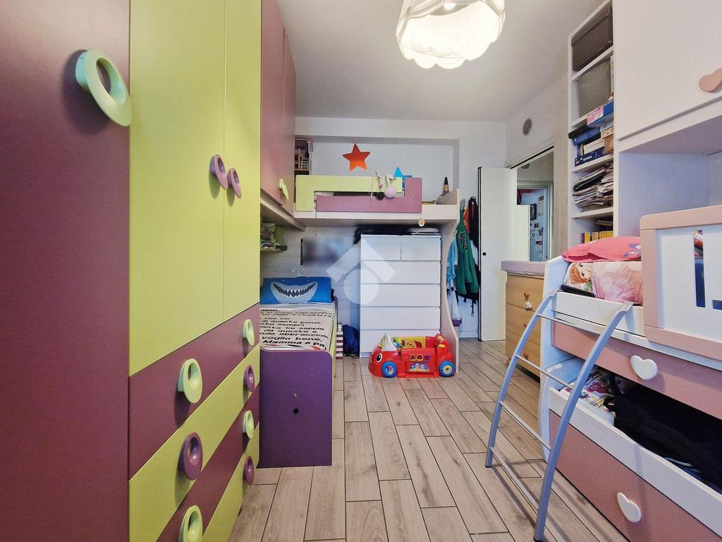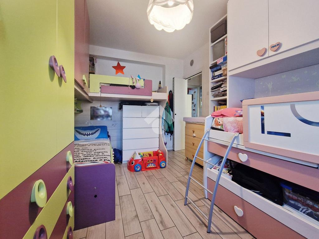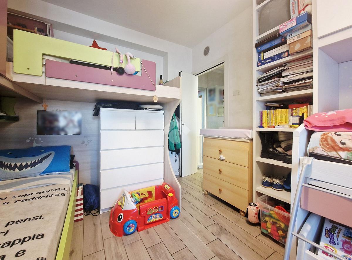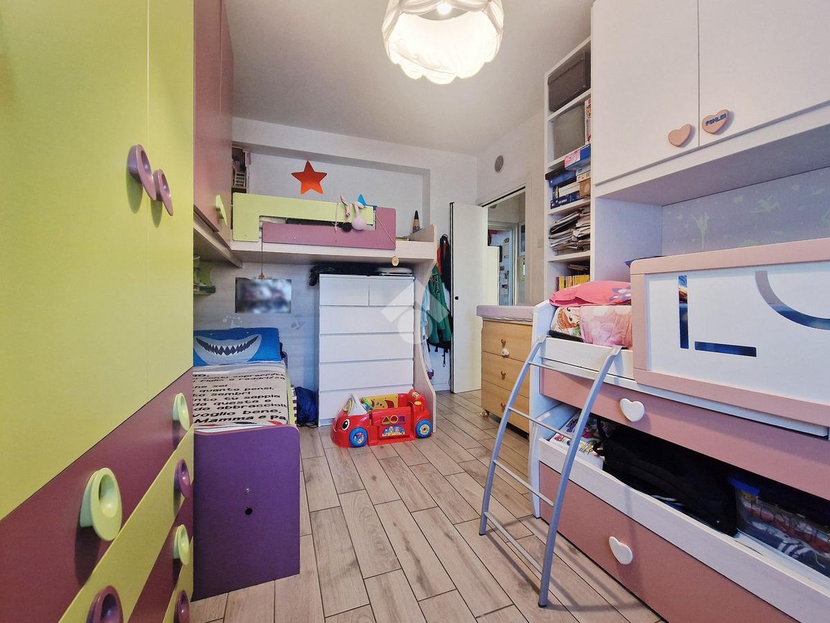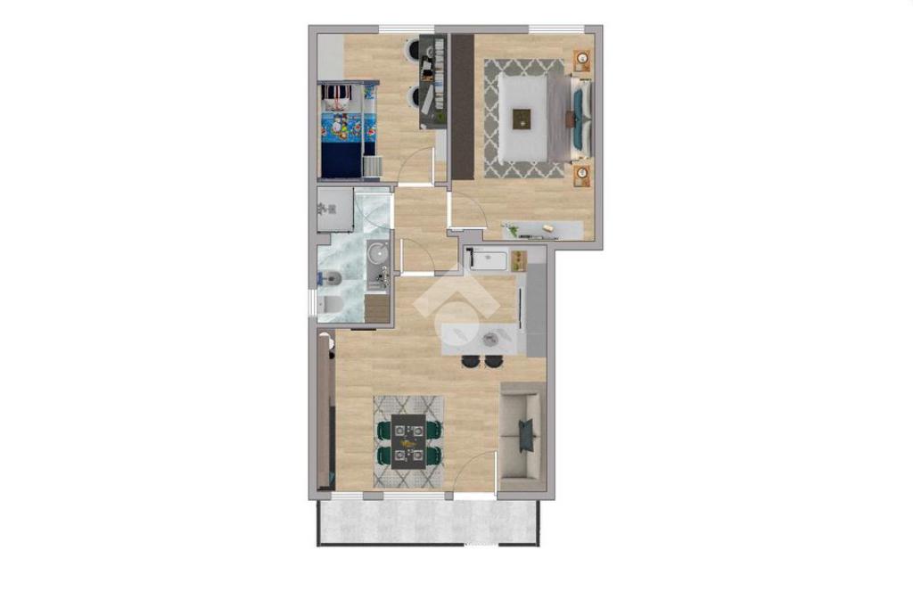 L'ingresso è sulla zona giorno con cucina a vista mentre il disimpegno conduce al bagno finestrato e alle due camere da letto.