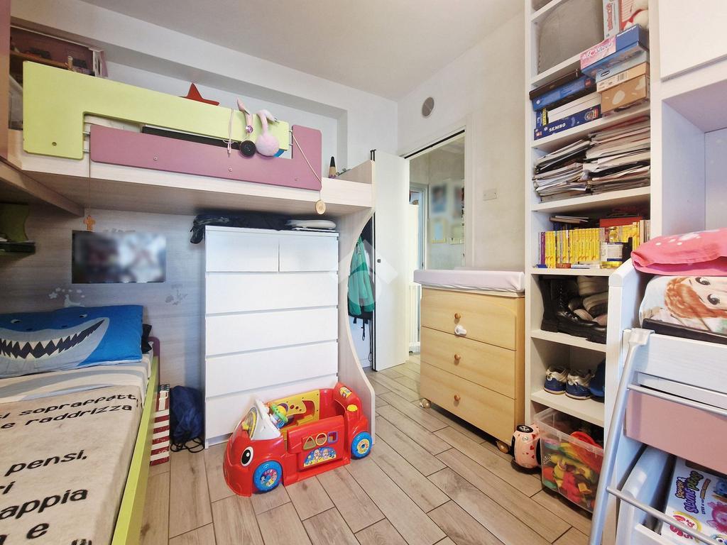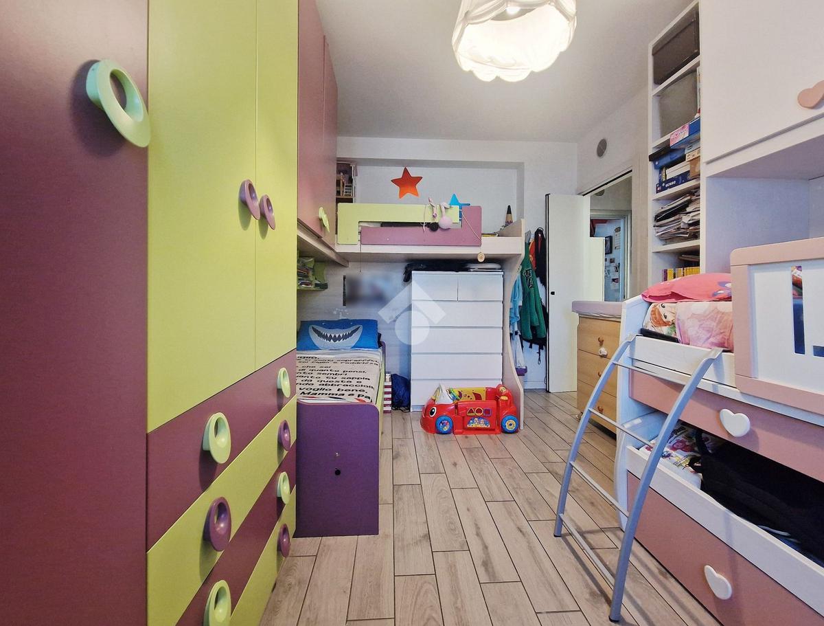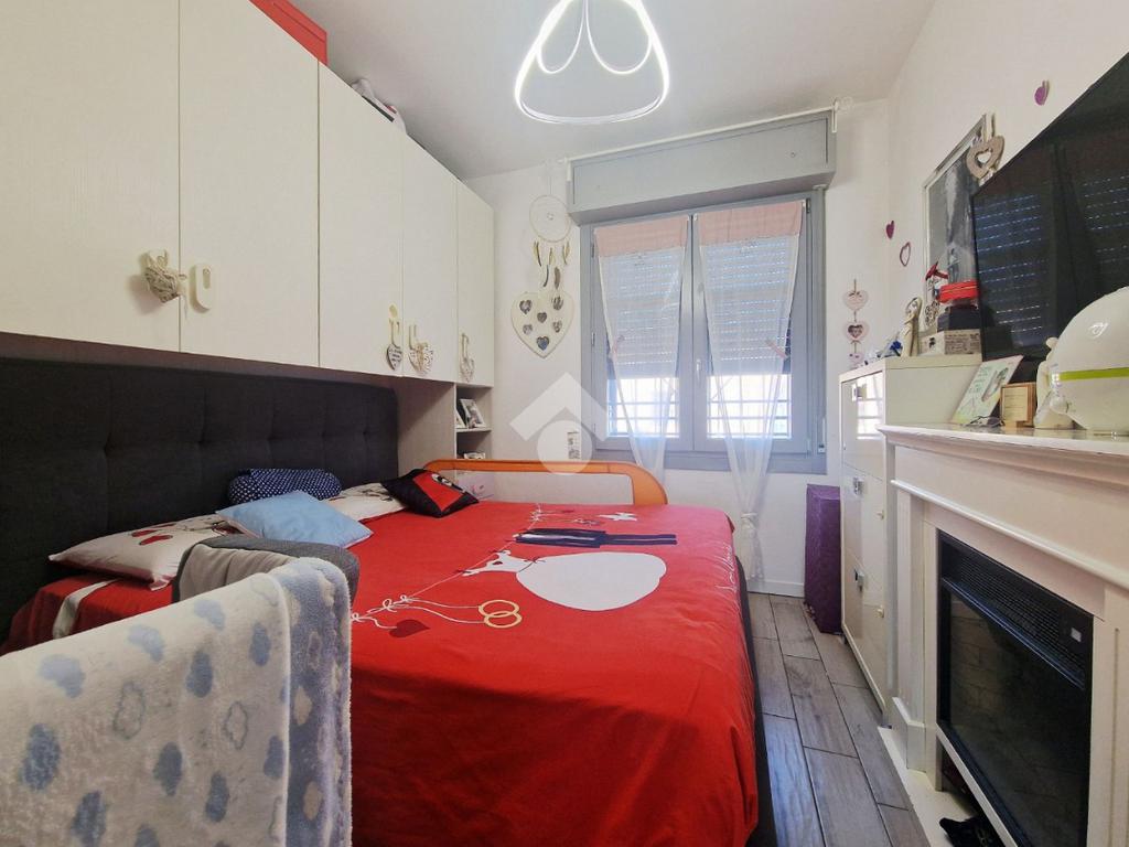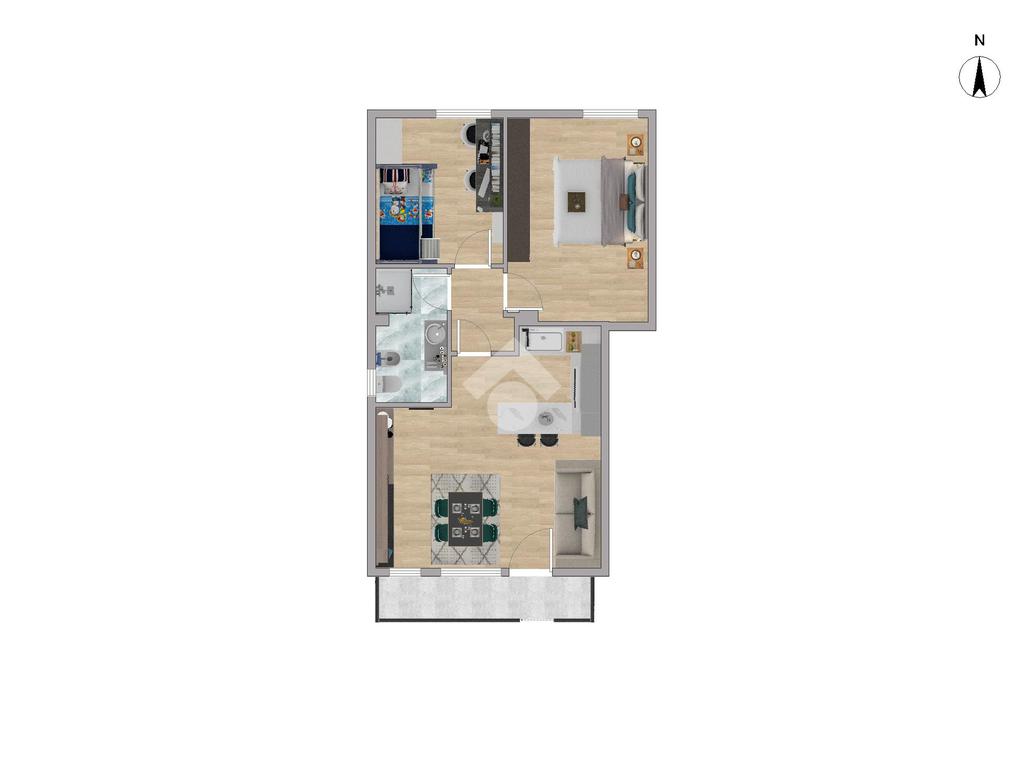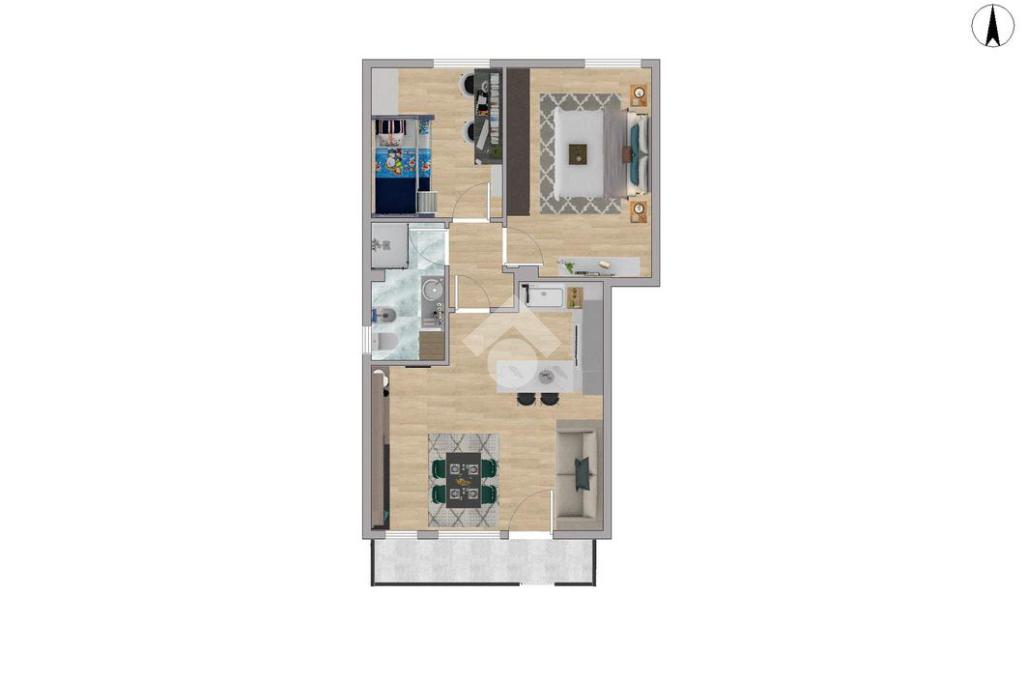 L'ingresso è sulla zona giorno con cucina a vista mentre il disimpegno conduce al bagno finestrato e alle due camere da letto.
