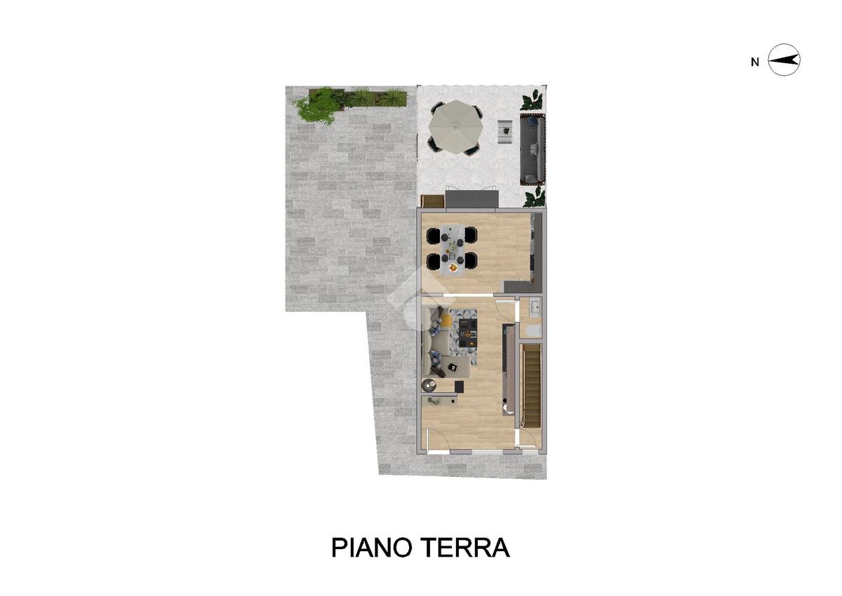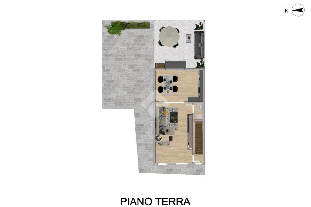 L'abitazione presenta un giardino privato e il piano terra è caratterizzato dalla presenza della zona giorno con cucina a vista e ampio soggiorno