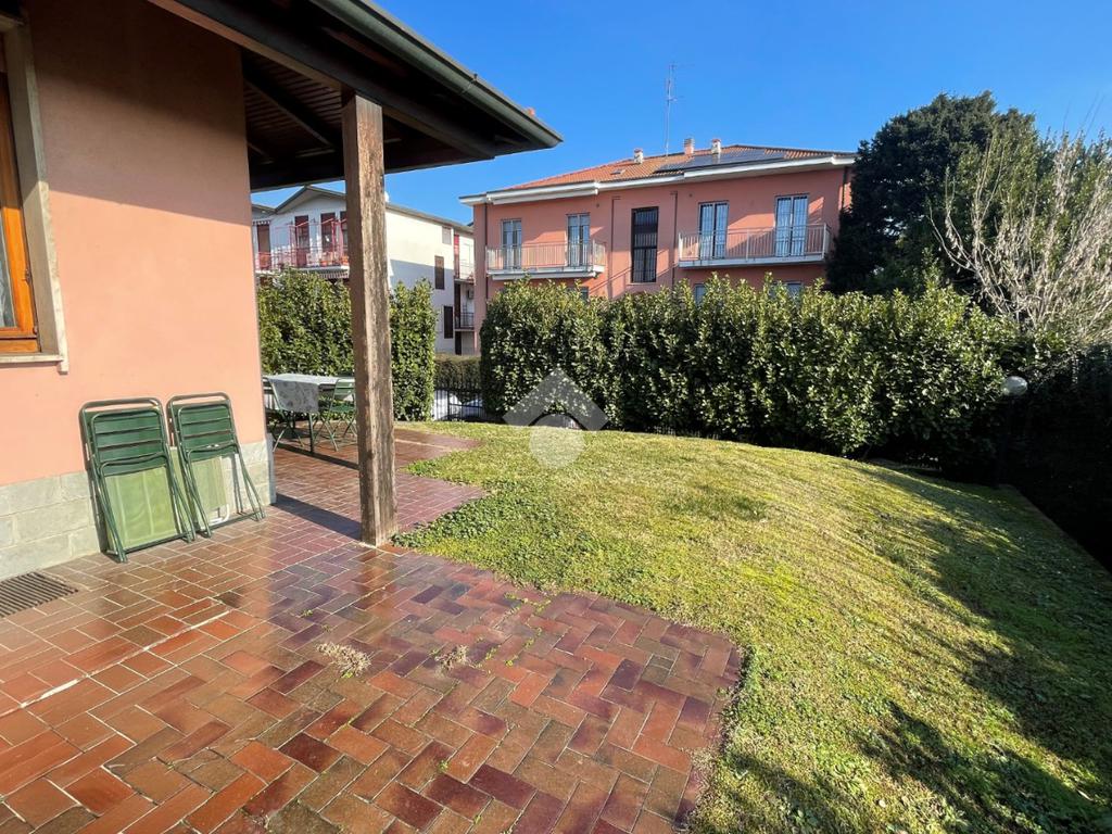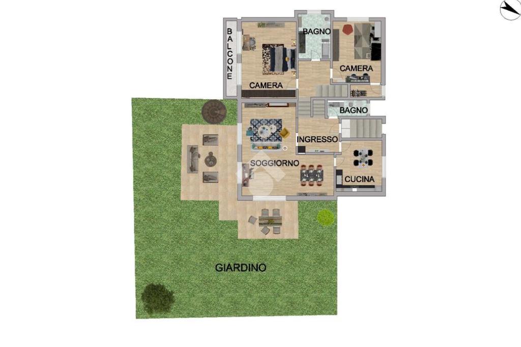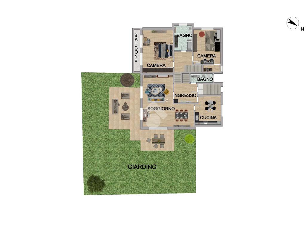L'abitazione dispone di ingresso indipendente e presenta un ampio e luminoso soggiorno doppio, valorizzato da un camino in muratura e l'uscita sul giardino, una cucina abitabile, la camera da letto matrimoniale con balcone, una spaziosa cameretta e due bagni finestrati.